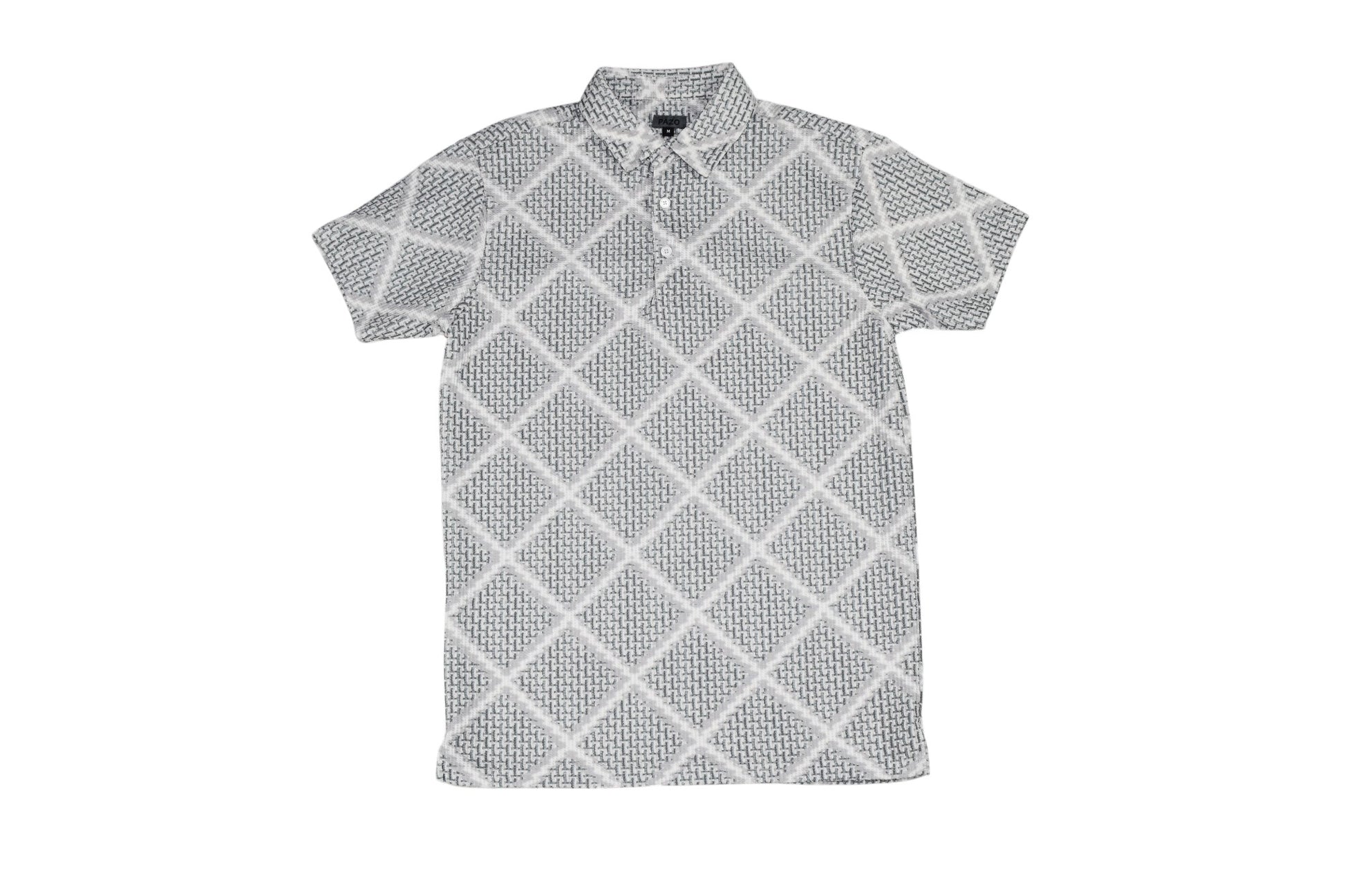 Step up your casual game with this Diamond Geo Print Polo in White and Grey. Featuring an all-over diamond argyle overlay on a detailed geometric micro-pattern, this short-sleeve polo delivers a bold printed look that stands out from the basics. The tonal white and grey colorway keeps it versatile and easy to style, while the classic polo collar and button placket give it a clean, structured finish.